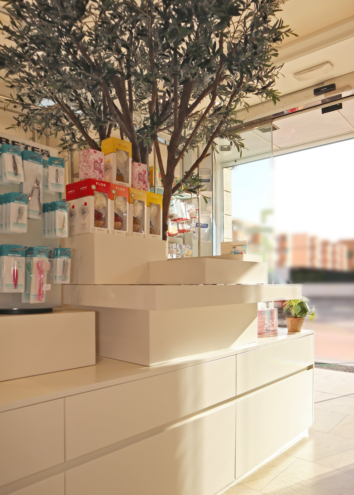 En el centro se ubica una isla de bienvenida presidida por un olivo, con módulos de exposición que actúan como escaparate interior, captando la atención desde cualquier ángulo.