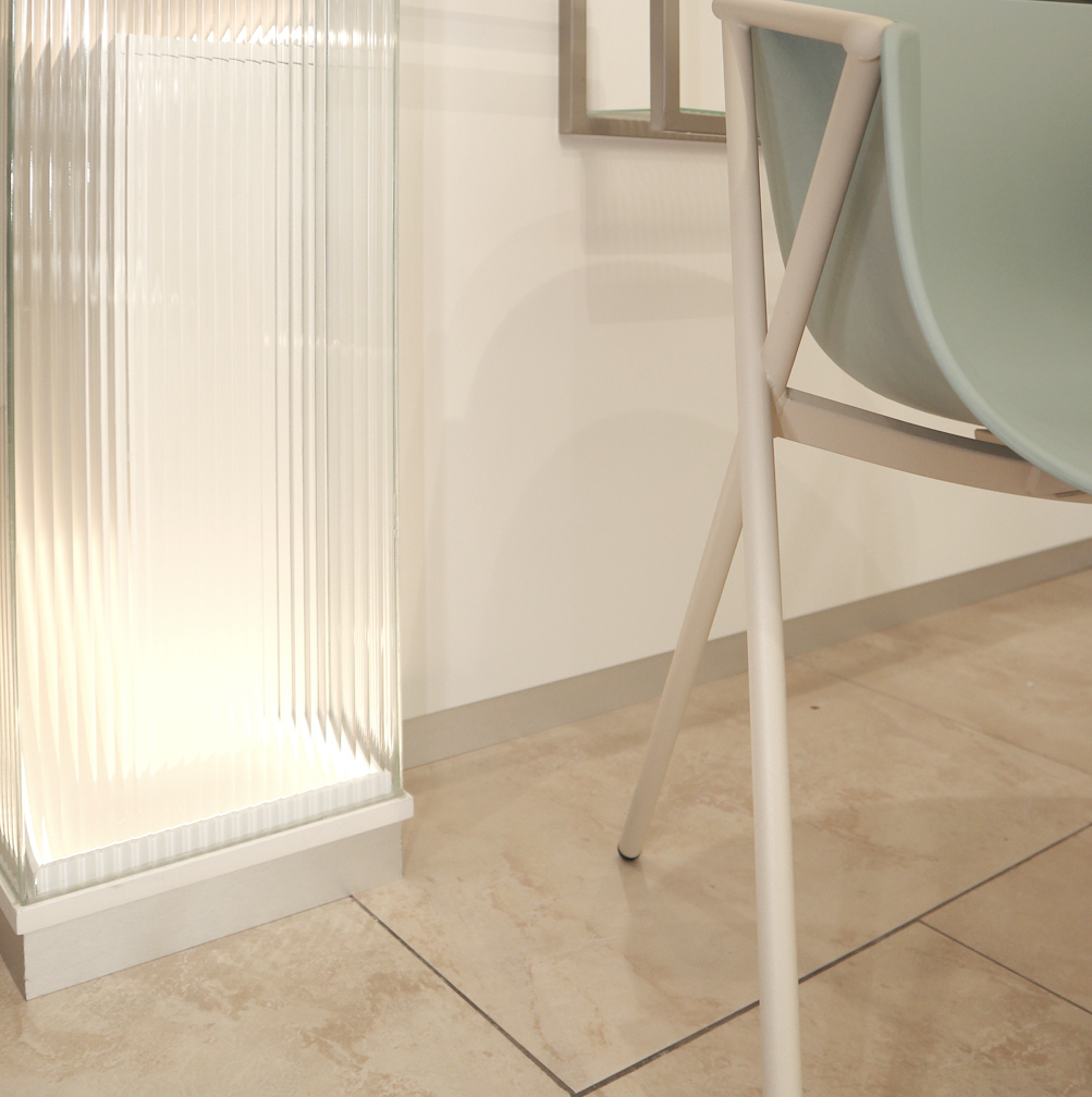 Los mostradores, diseñados a medida, están realizados en vidrio acanalado con estructura de metal lacado de perfil cuadrado. Se iluminaron desde su interior parar resaltar su ligereza y sus volúmenes.