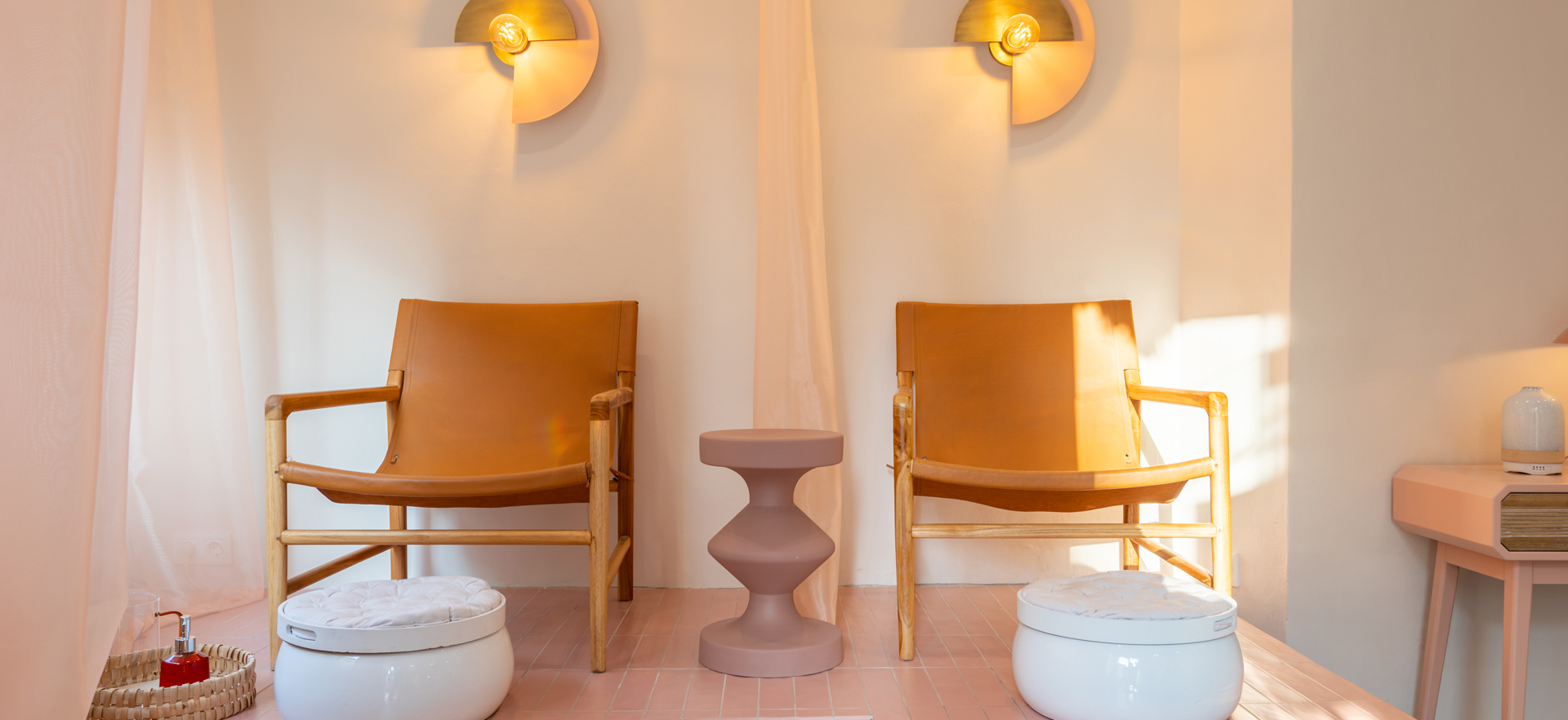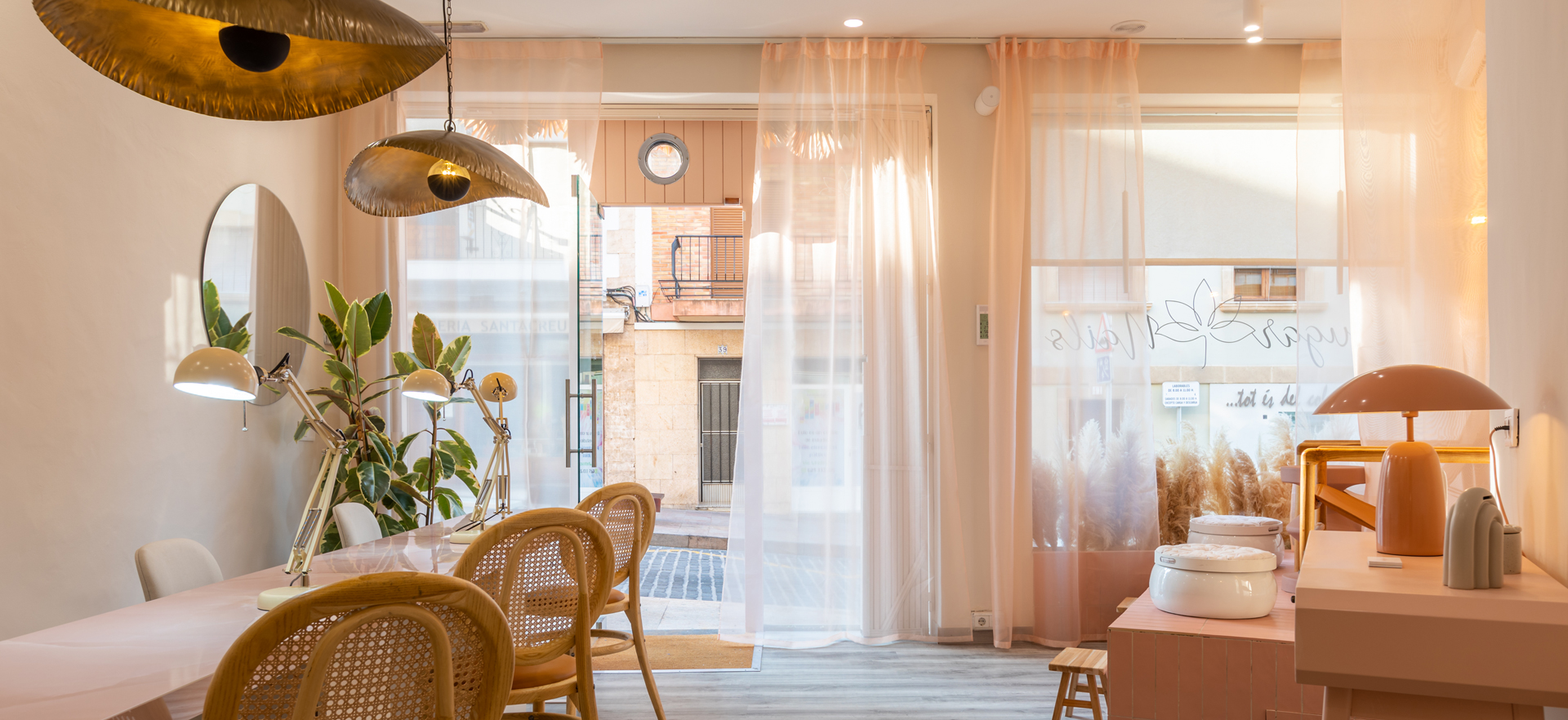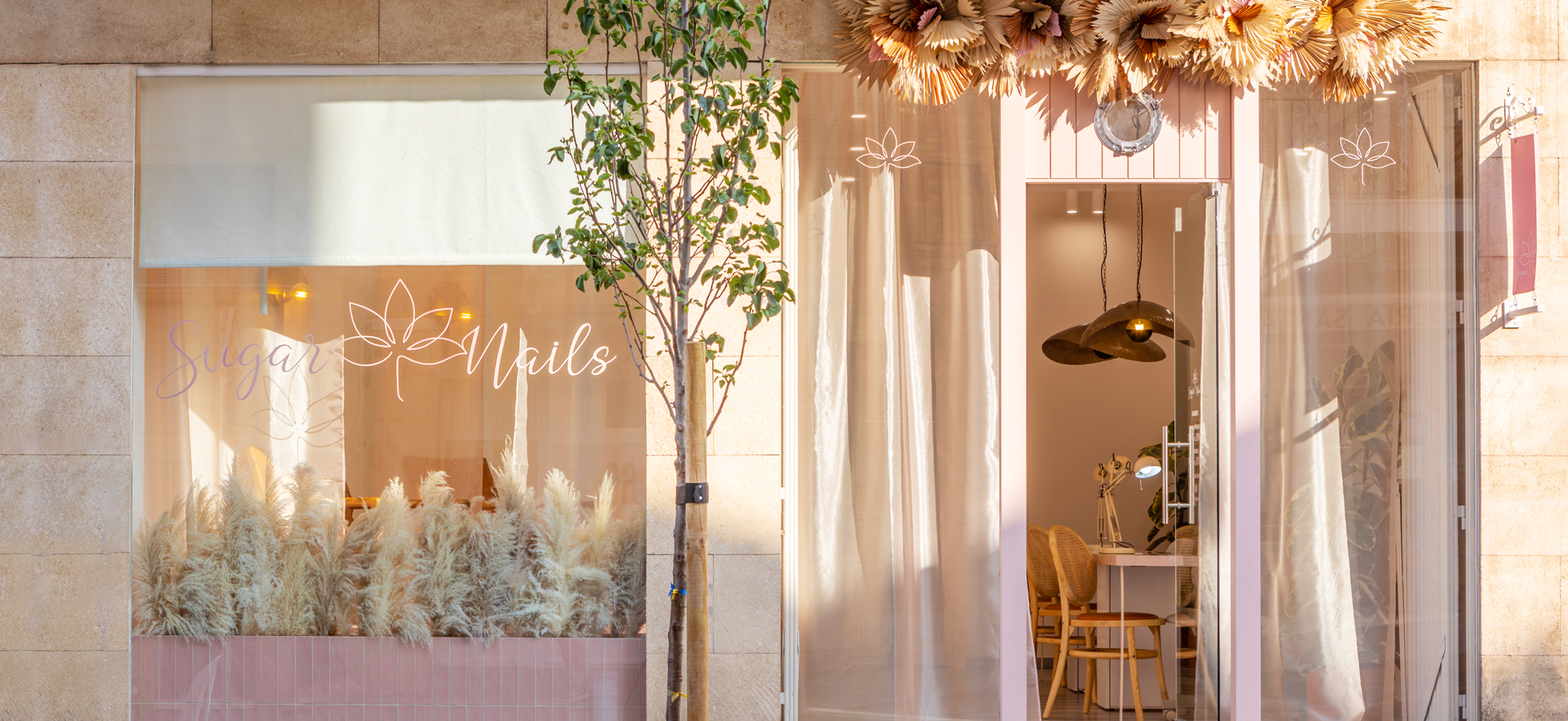 El proyecto de reforma de la sala de manicuras Sugar Nails es ya, desde el exterior, una invitación al autocuidado. Un espacio armónico y en calma, diseñado en tonos pastel, que se deja intuir tras las cortinas semitransparentes. Sobre el acceso, una instalación natural que armoniza con la piedra tosca y la laca en rosa palo. En la zona de pedicuras, el azulejo de pequeño formato nos aporta ritmo compositivo, mientras que los asientos y la mesita auxiliar equilibran, con sus formas sinuosas, la rigidez de líneas.