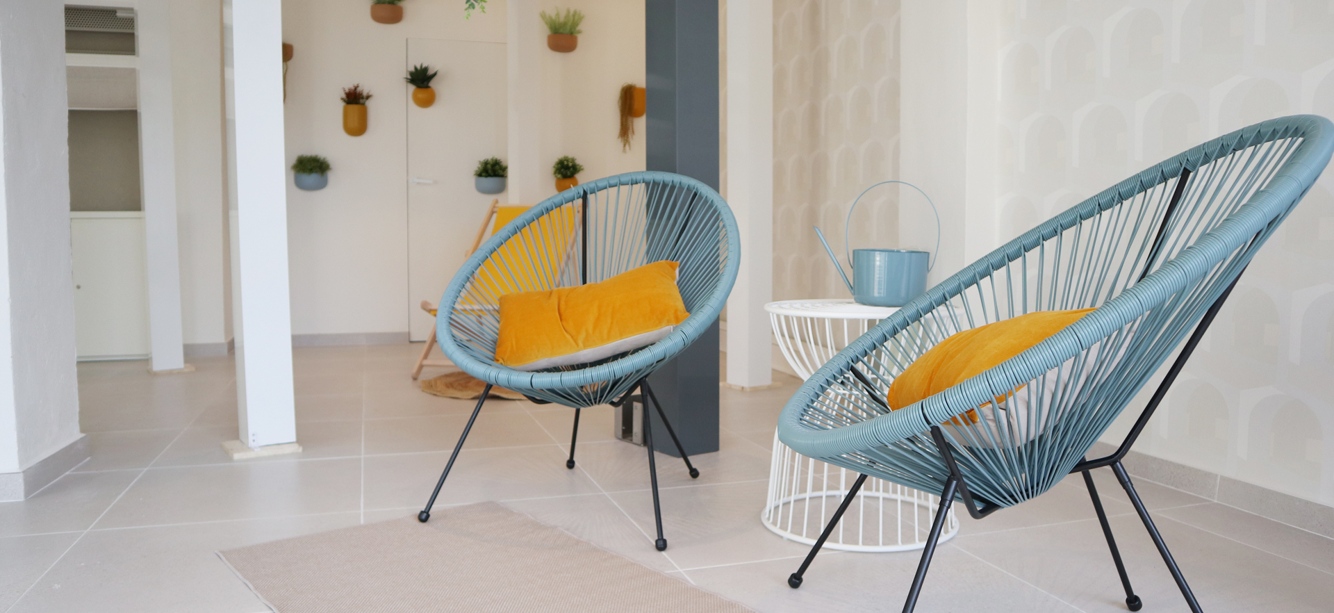 Las paredes laterales se revistieron con un papel pintado de diseño de arcos, creando un elegante pórtico visual que hace referencia a las estructuras de sombra que la empresa diseña e instala en Jávea, Dénia y toda la provincia de Alicante.